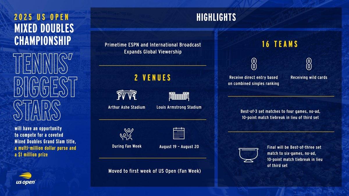 入围规则也发生了变化,八组选手将依据其单打综合排名直接入围,而非过去的双打综合排名。另外八组选手将通过外卡获得参赛资格。美网官方表示,此次调整是受到去年赛前举办的“混双狂热(Mixed Madness)”表演赛成功经验的启发。当时,该赛事邀请了多位知名单打球员组成混双组合参赛。